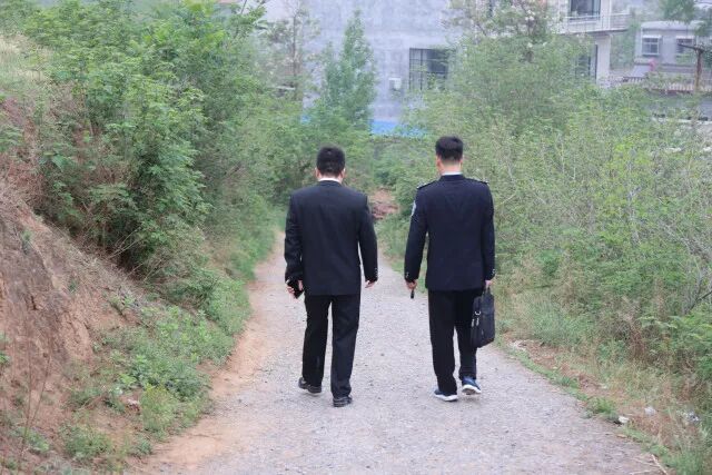 早上7点,送达干警行走在乡间小路为当事人送达手续