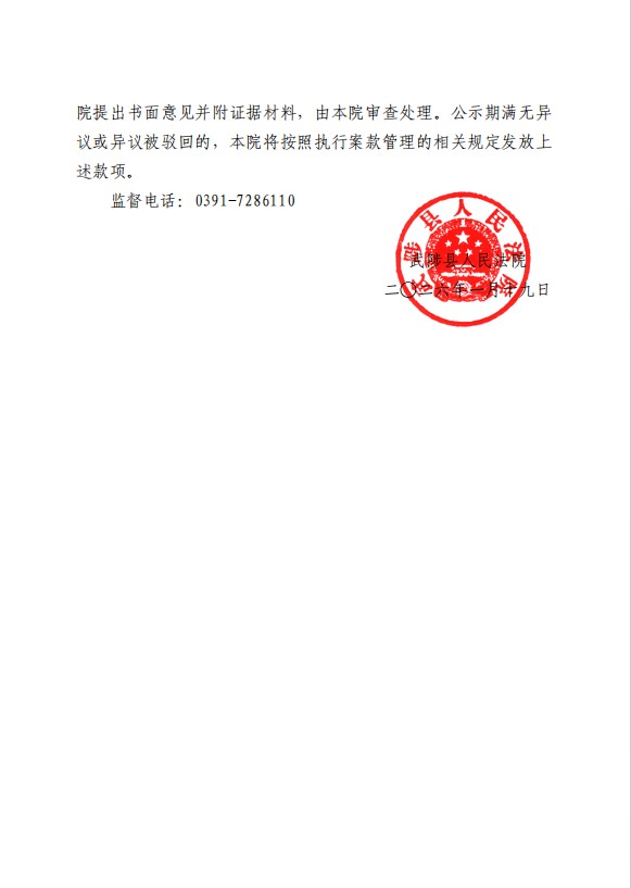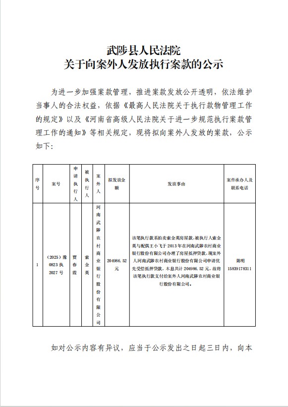 武陟县人民法院关于向案外人发放执行案款的公示(2026年第4期)