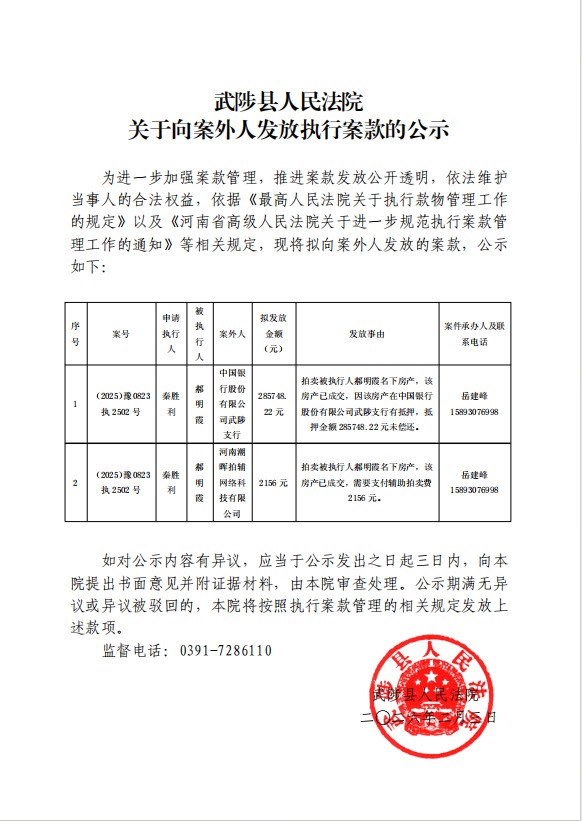 武陟县人民法院关于向案外人发放执行案款的公示(2026年第5期)
