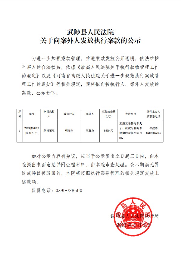 武陟县人民法院关于向案外人发放执行案款的公示(2026年第6期)