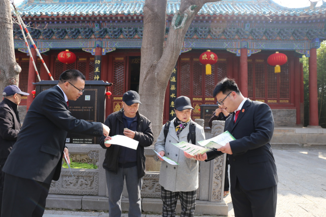 “一座嘉应观,半部治黄史”。3月17日至21日,“福满武陟”嘉应观第四届龙抬头民俗文化节在嘉应观4A级景区举行,吸引了各地游客纷至沓来。为精准服务当地文旅产业发展需求、切实回应群众的法律诉求,武陟县法院积极组织干警深入景区开展专项普法宣传活动,以司法力量护航文旅融合高质量发展。活动现场,干警们通过发放宣传彩页、面对面咨询、案例讲解等形式,向游客宣讲旅游法、生态环境法典以及黄河保护法等法律法规,释明旅游消费维权、消防安全、人身安全等问题,让游客了解掌握风险防范、维权途径以及破坏生态环境、不文明旅游等行为的法律后果,并耐心解答群众提出的法律疑问,倡导群众树立生态环境保护理念,文明旅游、爱护环境,共同维护黄河流域生态安全与景区文明秩序。